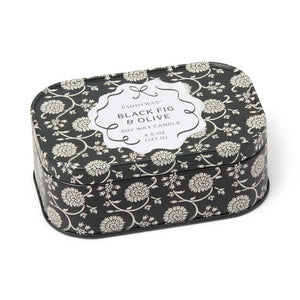 The Black Fig & Olive Chérie Tin Candle features a reusable patterned tin with two wicks, a hinged lid, and a removable label. Encased in a sleek black and grey patterned tin, this hand-poured candle features the captivating aroma of Black Fig & Olive—a rich, earthy, and subtly fruity fragrance that adds depth and elegance to any room.